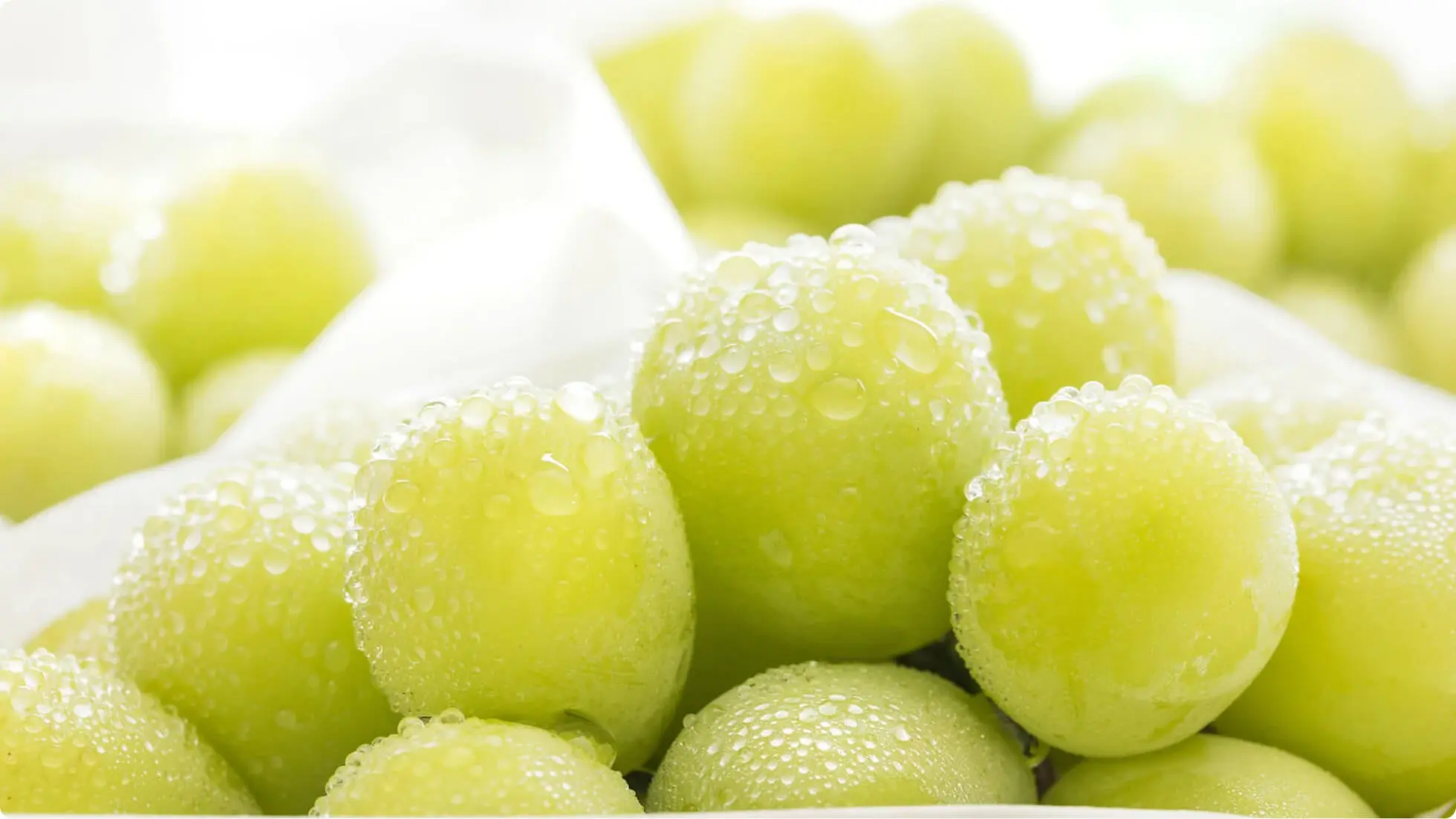 光をまとったように美しく輝く、みずみずしい翠色。大粒で張りのある果皮を軽く噛むと「パリッ」と心地よい音を立てて弾け、濃厚な甘みと芳醇な香りが口いっぱいに広がっていく―。